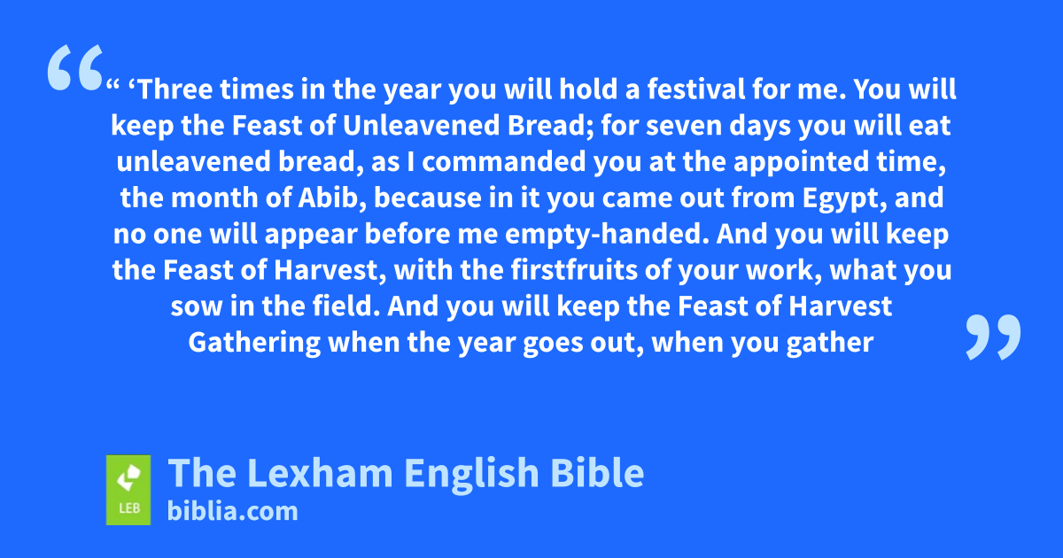 14 “ ‘Three times in the year you will hold a festival for me. 15 You will keep the Feast of Unleavened Bread; for seven days you will eat unleavened bread, as I commanded you at the appointed time, the month of Abib, because in it you came out from Egypt, and ⌊no one will⌋l appear before me empty-handed. 16 And you will keep the Feast of Harvest, with the firstfruits of your work, what you sow in the field. And you will keep the Feast of Harvest Gathering when the year goes out, when you gather your work from the field. 17 Three times in the year all your men will appear before the Lord Yahweh.