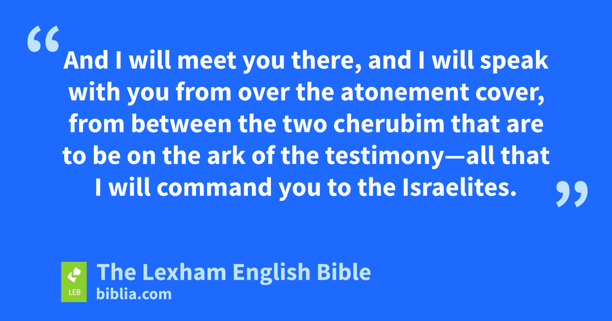 17 “And you will make an atonement cover of pure gold, two and a half cubits its length and a cubit and a half its width. 18 And you will make two cherubim of gold; you will make them of hammered work at the two ends of the atonement cover. 19 And make one cherub ⌊at one end⌋d and one cherub ⌊at the other end⌋e of the atonement cover; you will make the cherubim on its two ends. 20 And the cherubim will be with outspread wings above, covering with their wings over the atonement cover ⌊and facing each other⌋;f the faces of the cherubim will be toward the atonement cover. 21 And you will put the atonement cover above onto the ark, and into the ark you will put the testimony that I will give you. 22 And I will meet you there, and I will speak with you from over the atonement cover, from between the two cherubim that are to be on the ark of the testimony—all that I will command you to the ⌊Israelites⌋.g