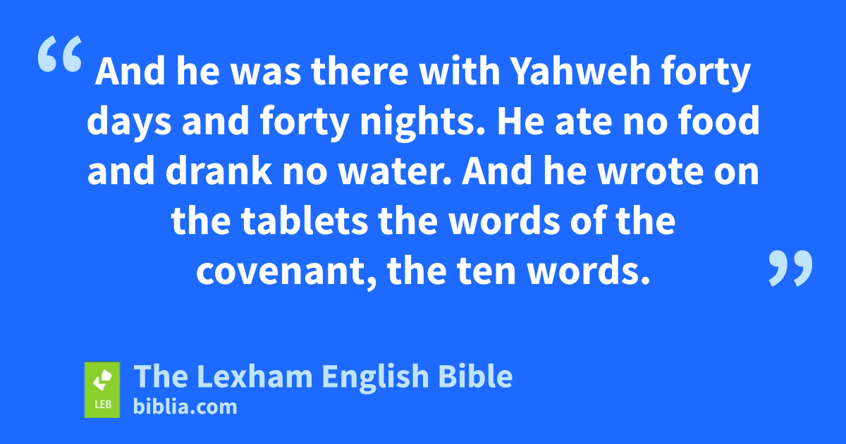 28 And he was there with Yahweh forty days and forty nights. He ate no food and drank no water. And he wrote on the tablets the words of the covenant, the ten words. 29 ⌊And⌋m when Moses came down from Mount Sinai, the two tablets of the testimony were in the hand of Moses at his coming down from the mountain; and Moses did not know that the skin of his face shone because of his speaking with him. 30 And Aaron and all the ⌊Israelites⌋n saw Moses, and, ⌊to their amazement⌋,o the skin of his face shone, and they were afraid of coming near to him. 31 And Moses called to them, and Aaron and all the leaders of the community returned to him, and Moses spoke to them. 32 And afterward all the ⌊Israelites⌋p came near, and he commanded them all that Yahweh had spoken with him on Mount Sinai. 33 And Moses finished speaking with them, and he put a veil on his face. 34 And when Moses came before Yahweh to speak with him, he would remove the veil until he went out, and he would go out and would speak to the ⌊Israelites⌋q what he had been commanded. 35 And the ⌊Israelites⌋r would see the face of Moses, that the skin of the face of Moses shone, and Moses would put back the veil on his face until his coming to speak with him.