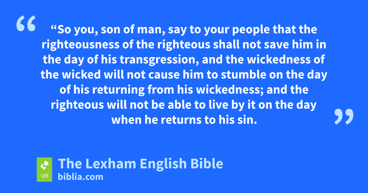 12 “Sos you, son of man,t say to ⌊your people⌋u that the righteousness of the righteous shall not save him in the day of his transgression, and the wickedness of the wicked ⌊will not cause him to stumble⌋v on the day of his returning from his wickedness; and the righteous will not be able to live by it on the day when he returns to his sin. 13 When I say to the righteous, ‘Certainly he will live,’ and he trusted inw his righteousness, and he turns and he does injustice, all of his righteousnessx will not be remembered, and because of his injustice that he did, because of it he will die. 14 And when I say to the wicked, ‘Certainly you will die,’ buty he returns from his sin and he does justice and righteousness— 15 for example, the wicked returns a pledge for a loan, he restores ⌊stolen property⌋,z he goes in the statutes of life so as not to do injustice—certainly he will live; he will not die. 16 All of his ⌊sins that he committed⌋,a they will not be remembered againstb him, and he did justice and righteousness; certainly he will live.
