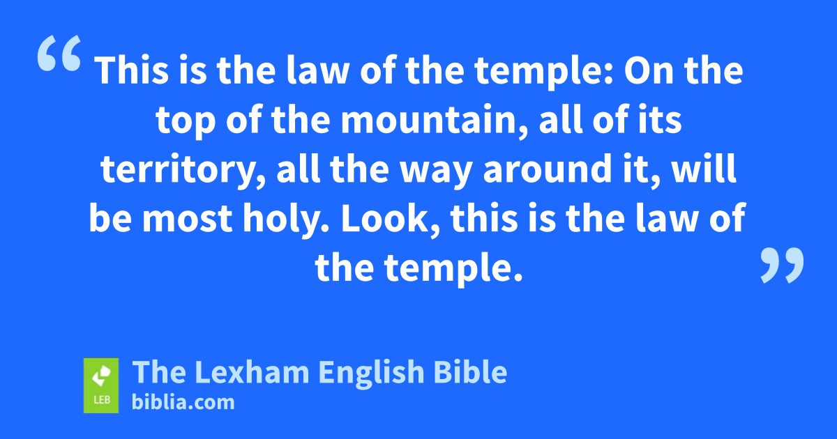 10 You, son of man,u describe to the house of Israel the temple and let them be ashamed of their iniquities and let them measure the pattern. 11 And if they are ashamed of all that they did, then the plan of the temple and its arrangement and its exits and its entrances and all of its plansv and all of its statutes. And all of its plansw and all of its lawsx make known to them and write them before their eyes, so that they may remember all of its plans and all of its statutes, so that they do them! 12 This is the lawy of the temple: On the top of the mountain, all of its territory, ⌊all the way around it⌋,z ⌊will be most holy⌋.a Look, this is the law of the temple.