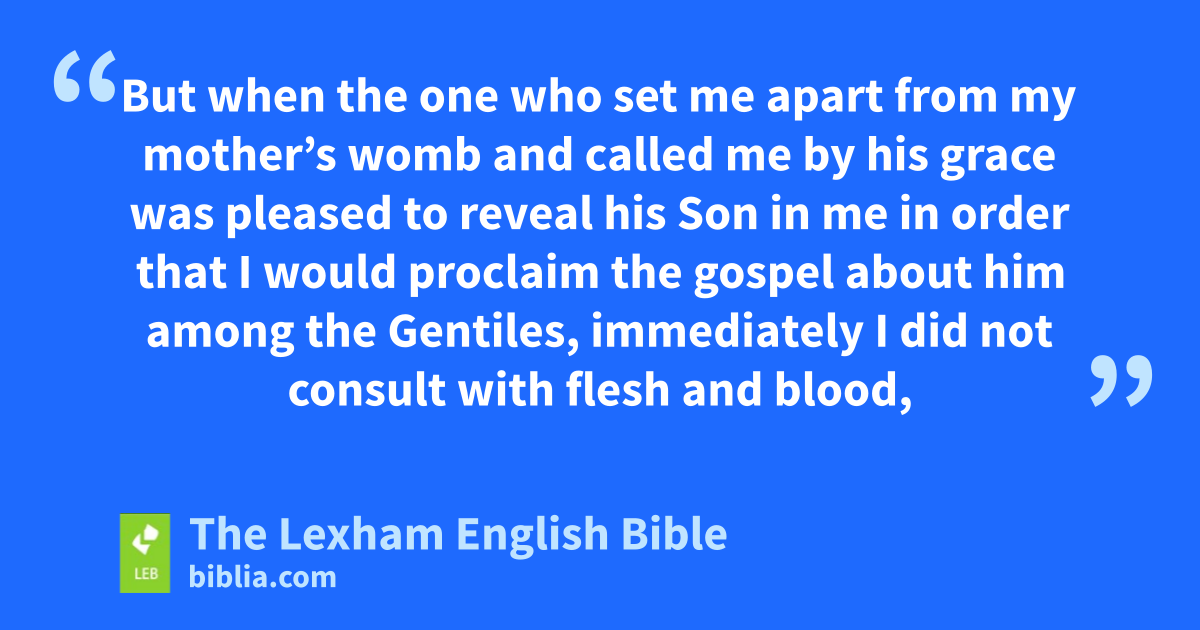 15 But when the one who set me apartc from my mother’s womb and called me by his grace was pleased 16 to reveal his Son in me in order that I would proclaim the gospel about him among the Gentiles, immediately I did not consult with flesh and blood, 17 nor did I go up to Jerusalem to those who were apostles before me, but I went away to Arabia and I returned again to Damascus. 18 Then after three years I went up to Jerusalem to become acquainted with Cephas, and I stayed with him fifteen days, 19 but I did not see any others of the apostles except James, the brother of the Lord. 20 (Now the things which I am writing to you, behold, I assure you before God that I am not lying.) 21 Then I came to the regions of Syria and of Cilicia, 22 but I was unknown ⌊in person⌋d to the churches of Judea that are in Christ, 23 and they were only hearing, “The one formerly persecuting us is now proclaiming the faith that formerly he was attempting to destroy,” 24 and they were glorifying God because of me.