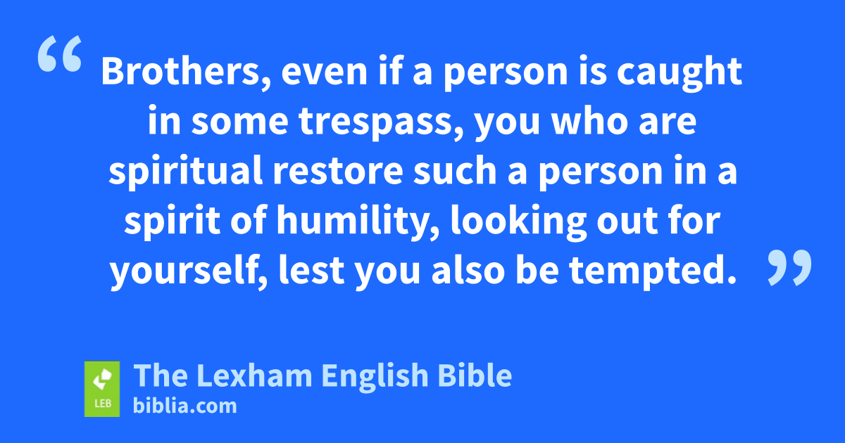 6 Brothers, even if a person is caught in some trespass, you who are spiritual restore such a person in a spirit of humility, looking out for yourself, lest you also be tempted. 2 Carry the burdens of one another, and so fulfill the law of Christ. 3 For if anyone thinks he is something although he* is nothing, he is deceiving himself. 4 But let each one examine his own work, and then he will have a reason for boasting in himself alone, and not in someone else. 5 For each one will carry his own burden.