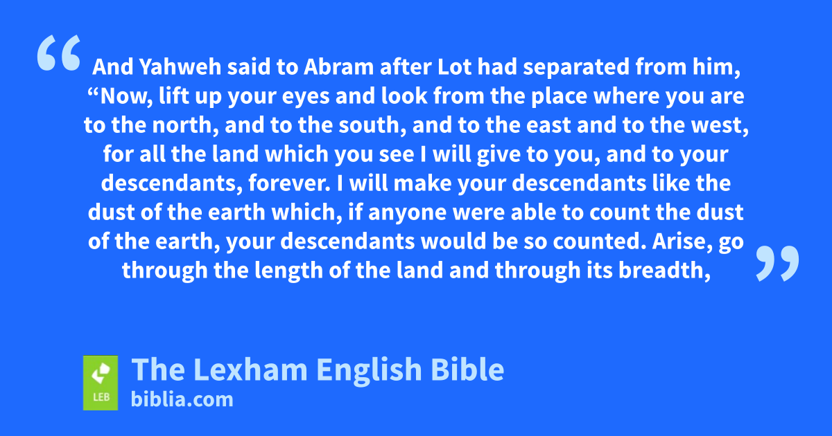 13 Then Abram went up from Egypt, he and his wife and all that was with him. And Lot went with him to the Negev. 2 Now Abram was very wealthy in livestock, in silver, and in gold. 3 And he went according to his journey from the Negev, then to Bethel, to the place where his tent was at the beginning, between Bethel and Ai, 4 to the place where he had made an altar at the beginning. And Abram called on the name of Yahweh there. 5 And Lot, who went with Abram, also had flocks and herds and tents. 6 And the land could not ⌊support them⌋a so as to live together, because their possessions were so many thatb they were not able to live together. 7 And there was a quarrel between the herdsmen of the livestock of Abram and the herdsmen of the livestock of Lot. Now at that time the Canaanites and the Perizzites were living in the land. 8 Then Abram said to Lot, “Please, let there not be quarreling between me and you, and between my shepherds and your shepherds, for we men are brothers. 9 Is not the whole land before you? Separate yourself from me. If you want what is on the left, then I will go right; if you want what is on the right, I will go left.” 10 And Lot lifted up his eyes and saw the whole plain of the Jordan, that all of it was well-watered land—this was before Yahweh destroyed Sodom and Gomorrah—like the garden of Yahweh, like the land of Egypt ⌊in the direction of⌋c Zoar. 11 Sod Lot chose for himself all the plain of the Jordan. And Lot journeyed ⌊eastward⌋,e and so they separated ⌊from each other⌋.f 12 Abram settled in the land of Canaan, and Lot settled in the cities of the plain. And he pitched his tent toward Sodom. 13 Now the men of Sodom ⌊were extremely wicked sinners against Yahweh⌋.g 14 And Yahweh said to Abram after Lot had separated from him, “Now, lift up your eyes and look from the place where you are to the north, and to the south, and to the east and to the west, 15 for all the land which you see I will give to you, and to your descendants, forever. 16 I will make your descendants like the dust of the earth which, if anyone were able to count the dust of the earth, your descendants would be so counted. 17 Arise, go through the length of the land and through its breadth, for I will give it to you.” 18 Soh Abram pitched his tent, and he came and settled at the oaks of Mamre, which were at Hebron. And there he built an altar to Yahweh.