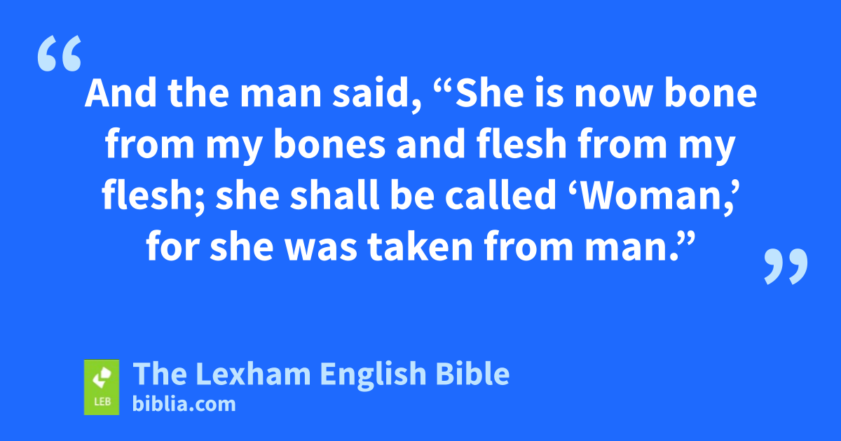 18 Thenv Yahweh God said, “it is not good that the manw is alone. I will make for him a helper ⌊as his counterpart⌋.”x 19 And out of the ground Yahweh God formed every beast of the field and every bird of the sky,y and he brought each to the manz to see what he would call it. And whatever the mana called that living creature was its name. 20 And the manb ⌊gave names⌋c to every domesticated animal and to the birds of heavend and to all the wild animals.e But for the man there was not found a helper ⌊as his counterpart⌋.f 21 And Yahweh God caused a deep sleep to fall upon the man.g Whileh he slept, he took one of his ribs, and closed up ⌊the flesh where it had been⌋.i 22 And Yahweh God fashioned the rib which he had taken from the manj into a woman and brought her to the man.k 23 And the manl said,