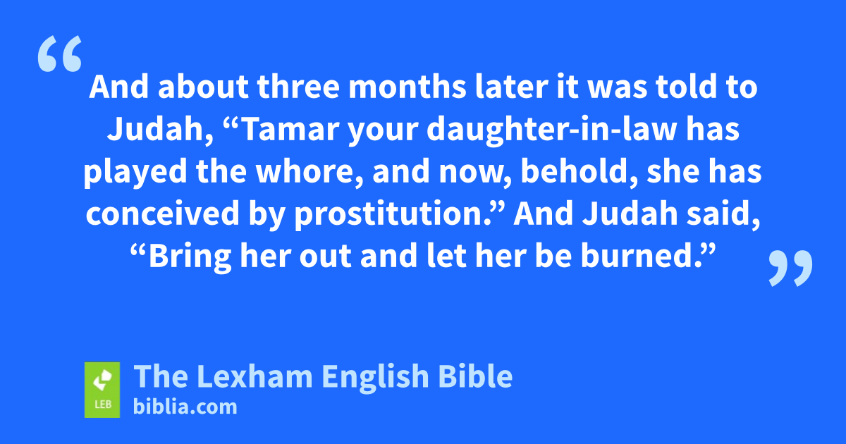 38 And it happened that at that time Judah went down from his brothers and pitched his tent near a certain Adullamite, whose name was Hirah. 2 And Judah saw the daughter of a certain Canaanite there whose name was Shua. And he took her and went in to her. 3 And she conceived and bore a son, and he called his name Er. 4 And she conceived again and bore a son, and he called his name Onan. 5 And once again she bore a son, and she called his name Shelah. And hea was in Chezib when she bore him. 6 And Judah took a wife for Er his firstborn, and her name was Tamar. 7 And Er, the firstborn of Judah, was evil in the eyes of Yahweh, and Yahweh killed him. 8 Then Judah said to Onan, “Go in to the wife of your brother and perform the duty of a brother-in-law to her, and raise up offspring for your brother.” 9 But Onan knew that the offspring would not be for him, so whenever he went in to the wife of his brother he would waste it on the groundb so as not to give offspring to his brother. 10 And what he did was evil in the sight of Yahweh, so he killed him also. 11 Then Judah said to Tamar, his daughter-in-law, “Stay a widow in your father’s house until Shelah my son grows up,” for ⌊he feared he would also die⌋c like his brother. So Tamar went and stayed in the house of her father. 12 ⌊And in the course of time⌋d the daughter of Shua, the wife of Judah, died. When Judah was consoled he went up to his sheepshearers, he and his friend Hirah the Adullamite, to Timnah. 13 And it was told to Tamar, saying, “Look, your father-in-law is going up to Timnah to shear his sheep.” 14 So she removed the clothes of her widowhood and covered herself with the veil and disguised herself. And she sat at the entrance to Eynayim, which is on the way to Timnah, for she saw that Shelah was grown but she had not been given to him as a wife. 15 And Judah saw her and reckoned her to be a prostitute, for she had covered her face. 16 And he turned aside to her at the roadside and said, “Please come, let me come in to you,” for he did not know that she was his daughter-in-law. And she said, “What will you give to me that you may come in to me?” 17 And he said, “I will send a kid from the goats of the flock.” And she said, “Only if you give a pledge until you send it.” 18 And he said, “What is the pledge that I must give to you?” And she said, “your seal, your cord, and your staff that is in your hand.” And he gave them to her and went in to her. And she conceived by him. 19 And she arose and left, and she removed her veil from herself and put on the garments of her widowhood. 20 And Judah sent the kid from the goats by the hand of his friend the Adullamite to take back the pledge from the hand of the woman, but he could not find her. 21 So he asked the men of her place, saying, “Where is that cult prostitute that was at Eynayim by the roadside?” And they said, “There is no cult prostitute here.” 22 Then he returned to Judah and said, “I could not find her. Morever, the men of the place said, ‘There is no cult prostitute here.’ ” 23 And Judah said, “Let her take them for herself, lest we be ⌊laughed at⌋.e Behold, I sent this kid, but you could not find her.” 24 And ⌊about three months later⌋f it was told to Judah, “Tamar your daughter-in-law has played the whore, and now, behold, she has conceived by prostitution.” And Judah said, “Bring her out and let her be burned.” 25 She was brought out, but she sent to her father-in-law saying, “By the man to whom these belong I have conceived.” And she said, “Now discerng to whom these belong: the seal and cord and the staff.” 26 Then Judah recognized them and said, “She is more righteous than I, since I did not give her to my son Shelah.” And he did not knowh her again. 27 And it happened that at the time she gave birth that, behold, twins were in her womb. 28 And it happened that at her labor one child put out a hand. And the midwife took it and tied a crimson thread on his hand saying, “This one came out first.” 29 Then his hand drew back and, behold, his brother came out, and she said, “What a breach you have made for yourself!” And she called his name Perez. 30 And afterward his brother who had the crimson thread on his hand came out. And his name was called Zerah.