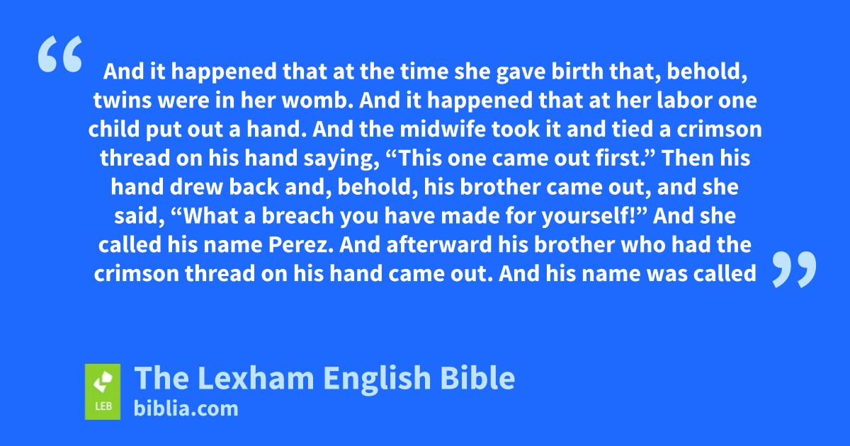38 And it happened that at that time Judah went down from his brothers and pitched his tent near a certain Adullamite, whose name was Hirah. 2 And Judah saw the daughter of a certain Canaanite there whose name was Shua. And he took her and went in to her. 3 And she conceived and bore a son, and he called his name Er. 4 And she conceived again and bore a son, and he called his name Onan. 5 And once again she bore a son, and she called his name Shelah. And hea was in Chezib when she bore him. 6 And Judah took a wife for Er his firstborn, and her name was Tamar. 7 And Er, the firstborn of Judah, was evil in the eyes of Yahweh, and Yahweh killed him. 8 Then Judah said to Onan, “Go in to the wife of your brother and perform the duty of a brother-in-law to her, and raise up offspring for your brother.” 9 But Onan knew that the offspring would not be for him, so whenever he went in to the wife of his brother he would waste it on the groundb so as not to give offspring to his brother. 10 And what he did was evil in the sight of Yahweh, so he killed him also. 11 Then Judah said to Tamar, his daughter-in-law, “Stay a widow in your father’s house until Shelah my son grows up,” for ⌊he feared he would also die⌋c like his brother. So Tamar went and stayed in the house of her father. 12 ⌊And in the course of time⌋d the daughter of Shua, the wife of Judah, died. When Judah was consoled he went up to his sheepshearers, he and his friend Hirah the Adullamite, to Timnah. 13 And it was told to Tamar, saying, “Look, your father-in-law is going up to Timnah to shear his sheep.” 14 So she removed the clothes of her widowhood and covered herself with the veil and disguised herself. And she sat at the entrance to Eynayim, which is on the way to Timnah, for she saw that Shelah was grown but she had not been given to him as a wife. 15 And Judah saw her and reckoned her to be a prostitute, for she had covered her face. 16 And he turned aside to her at the roadside and said, “Please come, let me come in to you,” for he did not know that she was his daughter-in-law. And she said, “What will you give to me that you may come in to me?” 17 And he said, “I will send a kid from the goats of the flock.” And she said, “Only if you give a pledge until you send it.” 18 And he said, “What is the pledge that I must give to you?” And she said, “your seal, your cord, and your staff that is in your hand.” And he gave them to her and went in to her. And she conceived by him. 19 And she arose and left, and she removed her veil from herself and put on the garments of her widowhood. 20 And Judah sent the kid from the goats by the hand of his friend the Adullamite to take back the pledge from the hand of the woman, but he could not find her. 21 So he asked the men of her place, saying, “Where is that cult prostitute that was at Eynayim by the roadside?” And they said, “There is no cult prostitute here.” 22 Then he returned to Judah and said, “I could not find her. Morever, the men of the place said, ‘There is no cult prostitute here.’ ” 23 And Judah said, “Let her take them for herself, lest we be ⌊laughed at⌋.e Behold, I sent this kid, but you could not find her.” 24 And ⌊about three months later⌋f it was told to Judah, “Tamar your daughter-in-law has played the whore, and now, behold, she has conceived by prostitution.” And Judah said, “Bring her out and let her be burned.” 25 She was brought out, but she sent to her father-in-law saying, “By the man to whom these belong I have conceived.” And she said, “Now discerng to whom these belong: the seal and cord and the staff.” 26 Then Judah recognized them and said, “She is more righteous than I, since I did not give her to my son Shelah.” And he did not knowh her again. 27 And it happened that at the time she gave birth that, behold, twins were in her womb. 28 And it happened that at her labor one child put out a hand. And the midwife took it and tied a crimson thread on his hand saying, “This one came out first.” 29 Then his hand drew back and, behold, his brother came out, and she said, “What a breach you have made for yourself!” And she called his name Perez. 30 And afterward his brother who had the crimson thread on his hand came out. And his name was called Zerah.