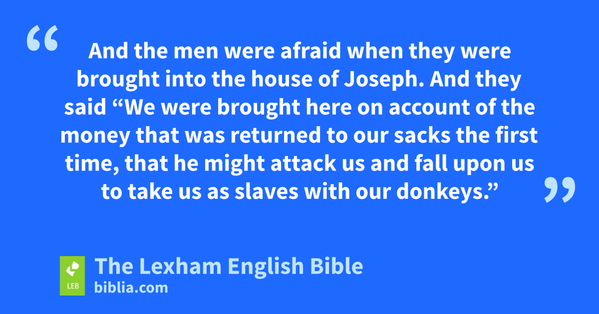 15 So the men took this gift, and they took double money in their hands, and Benjamin, and they rose up and went down to Egypt and stood before Joseph. 16 When Joseph saw Benjamin with them he said to the one who was over his household, “Bring the men into the house and slaughter and prepare an animal, for the men shall eat with me at noon.” 17 And the man did as Joseph had said, and the man brought the men into the house of Joseph. 18 And the men were afraid when they were brought into the house of Joseph. And they said “We were brought here on account of the money that was returned to our sacks the first time, that he might attack us and fall upon us to take us as slaves with our donkeys.” 19 So they approached the man who was over Joseph’s house and spoke to him at the doorway of the house. 20 And they said, “Please, my lord, we surely came down once before to buy food, 21 but when we came to the place of lodging and we opened our sacks, then behold, each one’s money was in the mouth of his sack—our money in its full weight—so we have returned with it in our hands. 22 Now, other money we have brought down in our hand to buy food. We do not know who put our money in our sacks.” 23 And he said, “Peace to you; do not be afraid. Your God and the God of your father must have given you a treasure in your sacks; your money came to me.” And he brought Simeon out to them. 24 Then the man brought the men into Joseph’s house and he gave them water and washed their feet, and gave fodder to their donkeys. 25 Then they laid outf the gift until Joseph came at noon, for they had heard that they were to eat food there. 26 And when Joseph came into the house they brought the gift that was in their hand into the house to him, and they bowed down before him to the ground. 27 And ⌊he greeted them⌋g and said, “Is your father well, the old man of whom you spoke? Is he still alive?” 28 And they said, “Your servant our father is well; he is still alive.” And they knelt and bowed down. 29 Then he lifted up his eyes and saw Benjamin his brother, the son of his mother, and said, “Is this your youngest brother of whom you told me?” And he continued,h “God be gracious to you, my son.” 30 Then Joseph ⌊hurried away⌋,i ⌊being overcome with emotion⌋j toward his brother, and sought for a place to cry. Then he went into a room and wept there. 31 Then he washed his face and went out, now controlling himself, and said, “Serve the food.” 32 And they served himk by himself, and them by themselves, and the Egyptians who were eating with him by themselves, for Egyptians ⌊could not dine⌋l with Hebrews, because that was a detestable thing to Egyptians. 33 And they were seated before him from the firstborn according to his birthright to the youngest according to his youth. And the men ⌊looked at one another⌋m amazed. 34 And portions were served to them from ⌊his table⌋,n and the portion of Benjamin was five times greater than the portion of any of them. And they drank and became drunk with him.