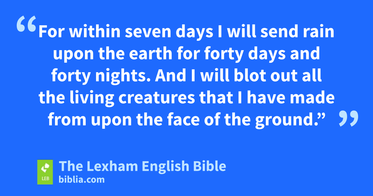 7 Thena Yahweh said to Noah, “Go—you and all your household—into the ark, for I have seen you are righteous before me in this generation. 2 From all the clean animals you must take for yourself ⌊seven pairs⌋,b a male and its mate. And from the animals that are not clean you must take two, a male and its mate, 3 as well as from the birds of heavenc ⌊seven pairs⌋,d male and female, ⌊to keep their kind alive⌋e on the face of all the earth. 4 For ⌊within seven days⌋f I will send rain upon the earth for forty days and forty nights. And I will blot out all the living creatures that I have made from upon the face of the ground.” 5 And Noah did according to all that Yahweh commanded him.