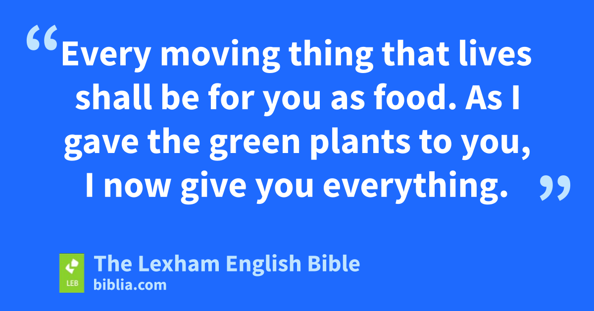 9 And God blessed Noah and his sons, and said to them, “Be fruitful and multiply, and fill the earth. 2 And fear of you and dread of you shall be upon every animal of the earth, and on every bird of heaven,a and on everything that moves upon the ground, and on all the fish of the sea. Into your hand they shall be given. 3 Every moving thing that lives shall be for you as food. As I gave the green plants to you, I now give you everything. 4 Only you shall not eat ⌊raw flesh with blood in it⌋.b 5 Andc ⌊your lifeblood⌋d I will require; from ⌊every animal⌋e I will require it. And from the hand of humankind, from the hand of each man to his brother I will require the life of humankind.