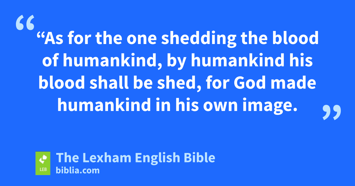 9 And God blessed Noah and his sons, and said to them, “Be fruitful and multiply, and fill the earth. 2 And fear of you and dread of you shall be upon every animal of the earth, and on every bird of heaven,a and on everything that moves upon the ground, and on all the fish of the sea. Into your hand they shall be given. 3 Every moving thing that lives shall be for you as food. As I gave the green plants to you, I now give you everything. 4 Only you shall not eat ⌊raw flesh with blood in it⌋.b 5 Andc ⌊your lifeblood⌋d I will require; from ⌊every animal⌋e I will require it. And from the hand of humankind, from the hand of each man to his brother I will require the life of humankind.