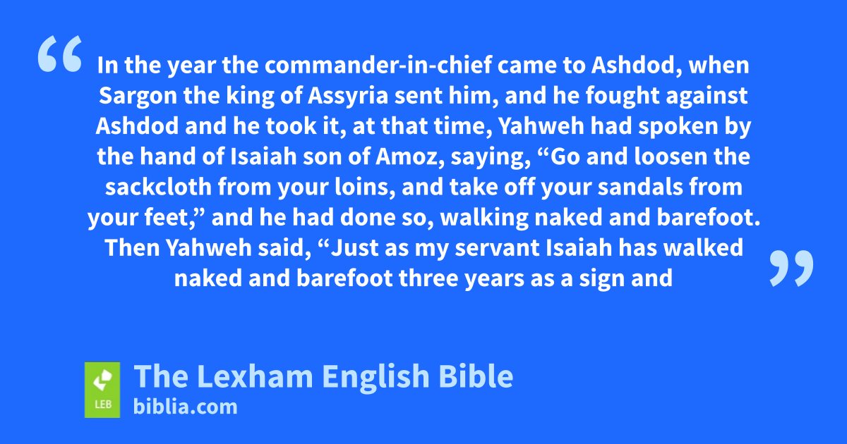 20 In the year ⌊the commander-in-chief came⌋a to Ashdod, when Sargon the king of Assyria sent him, and he fought against Ashdod and he took it, 2 at that time, Yahweh had spoken by the hand of Isaiah son of Amoz, saying,