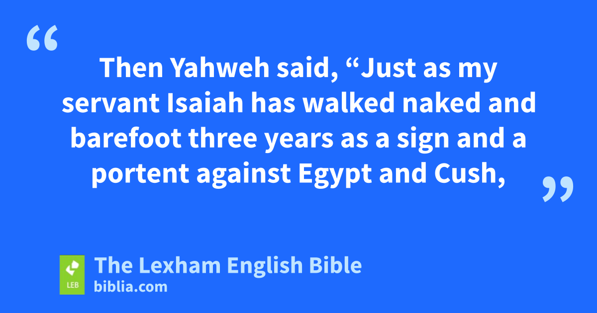 3 Thenc Yahweh said, “Just as my servant Isaiah has walked naked and barefoot three years as a sign and a portent against Egypt and Cush, 4 so shall the king of Assyria lead the captivesd of Egypt and the exiles of Cush, young and old, naked and barefoot, ⌊with bared buttocks⌋,e the shame of Egypt.