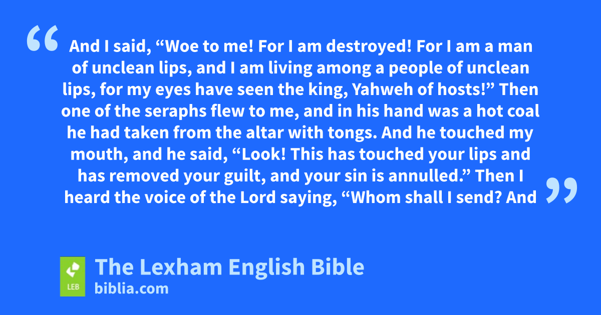 5 And I said, “Woe to me! For I am destroyed!d For I am a man ⌊of unclean lips⌋,e and I am living amongf a people ⌊of unclean lips⌋,g for my eyes have seen the king, Yahweh of hosts!”