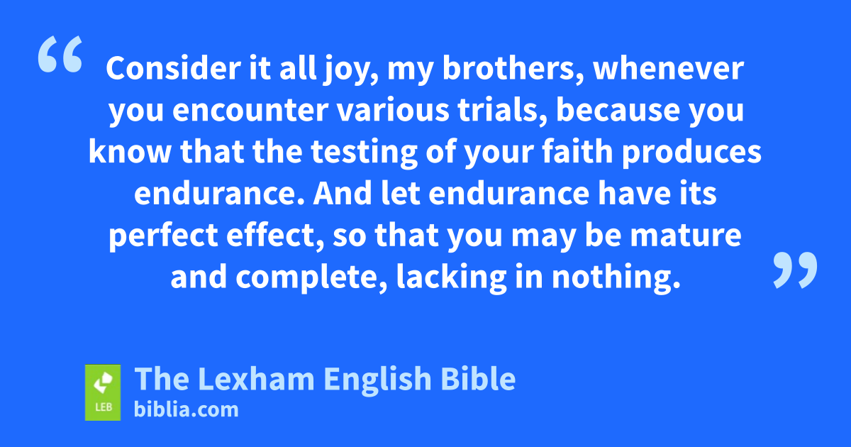 2 Consider it all joy, my brothers, whenever you encounter various trials, 3 because you* know that the testing of your faith produces endurance. 4 And let endurance have its perfect effect, so that you may be mature and complete, lacking in nothing.