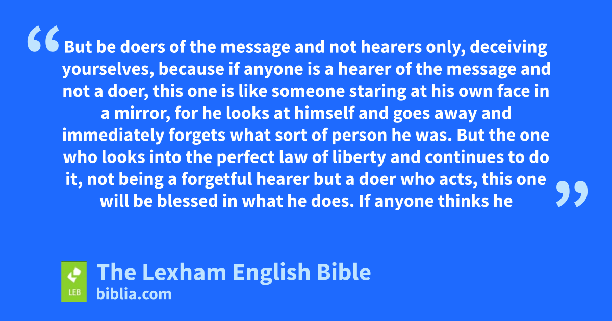 22 But be doers of the message and not hearers only,g deceiving yourselves, 23 because if anyone is a hearer of the message and not a doer, this one is like someoneh staring at ⌊his own face⌋i in a mirror, 24 for he looks at himself and goes away and immediately forgets what sort of person he was. 25 But the one who looks into the perfect law of liberty and continues to do it, not being a forgetful hearer but a doer who acts, this one will be blessed ⌊in what he does⌋j.