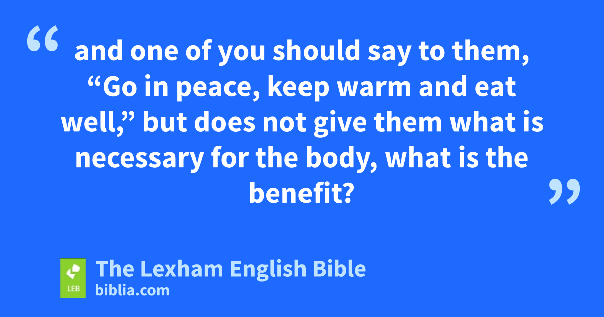 14 What is the benefit, my brothers, if someone says that he has faith but does not have works? That faith is not able to save him, is it?* 15 If a brother or a sister is poorly clothed and lacking food for the day, 16 and one of you should say to them, “Go in peace, keep warm and ⌊eat well⌋h,” but does not give them what is necessary for the body, what is the benefit? 17 Thus also faith, if it does not have works, is dead by itself.