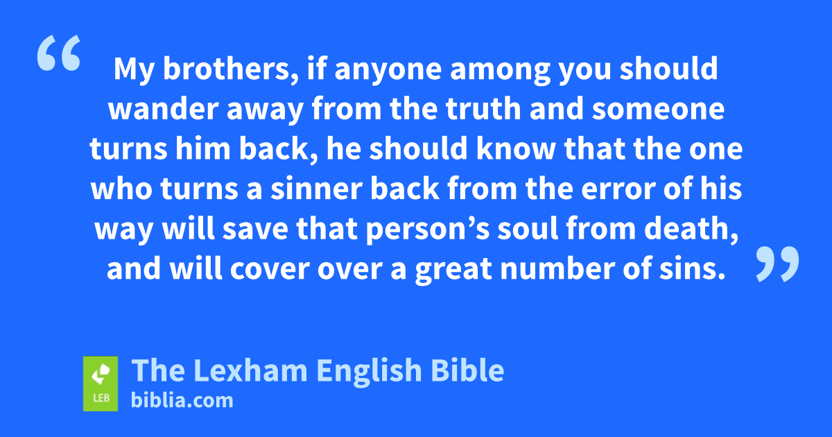 19 My brothers, if anyone among you should wander away from the truth and someone turns him back, 20 he should know that the one who turns a sinner back from the error of his way will save that person’se soul from death, and will cover over a great number of sins.