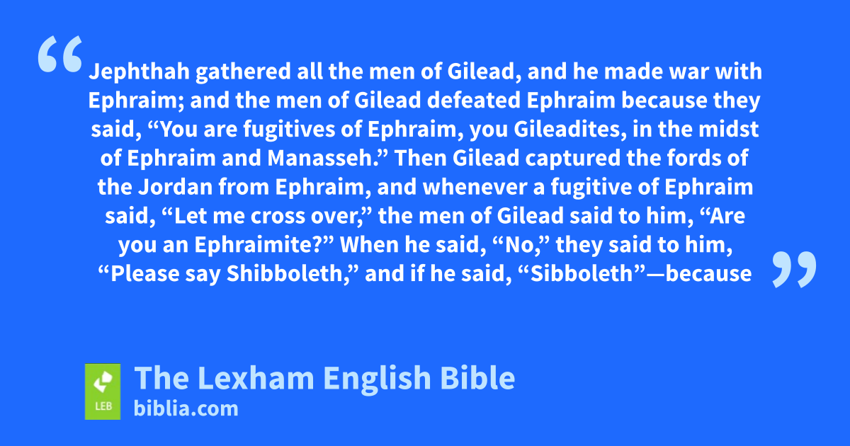 12 The men of Ephraim were called to arms, and they crossed over to Zaphon and said to Jephthah, “Why did you cross over and make war against the ⌊Ammonites⌋,a and why did you not call us to go with you? We will burn down your house over you with fire.” 2 And Jephthah said to them, “I and my people were engaged in great conflict with the ⌊Ammonites⌋;b I called you, but you did not deliver me from their hand. 3 I saw that you would not deliver us; ⌊I risked my own life⌋,c and I crossed over to the ⌊Ammonites⌋,d and Yahweh gave them into my hand. Why have you come up to me this day to fight against me?” 4 Jephthah gathered all the men of Gilead, and he made war with Ephraim; and the men of Gilead defeated Ephraim because they said, “You are fugitives of Ephraim, you Gileadites, in the midst of Ephraim and Manasseh.” 5 Then Gilead captured the fords of the Jordan from Ephraim, and whenever a fugitive of Ephraim said, “Let me cross over,” the men of Gilead said to him, “Are you an Ephraimite?” When he said, “No,” 6 they said to him, “Please say Shibboleth,” and if he said, “Sibboleth”—because he could not ⌊pronounce it⌋e correctly—they grabbed him and executed him at the fords of Jordan. At that time forty-two thousand from Ephraim fell.