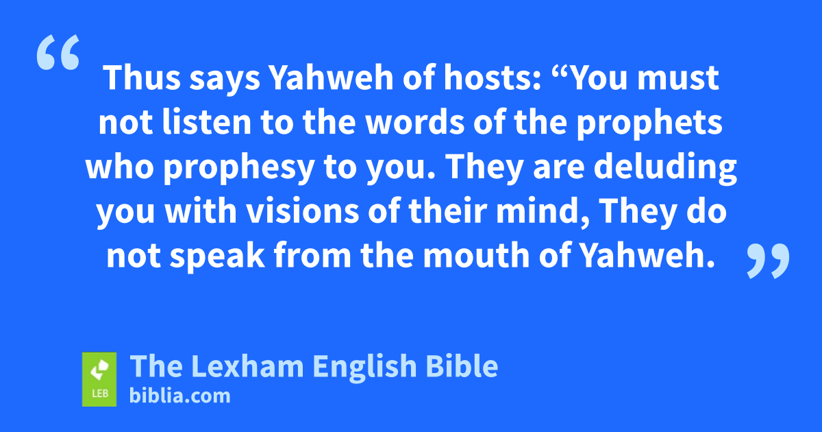 30 “⌊Therefore⌋n look, I am against the prophets,” ⌊declares⌋o Yahweh, “who steal my words each one from his neighbor. 31 Look, I am against the prophets,” ⌊declares⌋p Yahweh, “who take their tonguesq and declare as prophets, ‘Yahweh ⌊declares⌋.’r 32 Look, I am against those who prophesy dreams of lies,”s ⌊declares⌋t Yahweh, “and tell them, and they caused my people to err through their lies, and in their recklessness, when I myself have not sent them nor commanded them, so they profit not this people at all,” ⌊declares⌋u Yahweh.