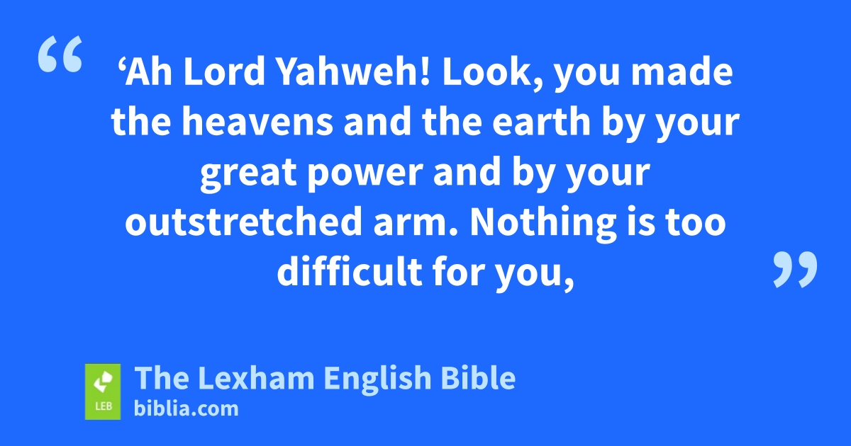 16 And I prayed to Yahweh—after giving my deed of the purchase to Baruch the son of Neriah—⌊saying⌋,x 17 ‘Ah Lord Yahweh! Look, you made the heavens and the earth by your great power and by your outstretched arm. ⌊Nothing⌋y is too difficult for you, 18 showing loyal love to the thousands, and repaying the guilt of ⌊parents⌋z into the lapsa of their children after them. Powerful, great, mighty, his name is Yahweh of hosts, 19 great in counsel and great in deed, whose eyes are opened to all the ways of the children of humankind, to give to each one according to his ways and according to the fruit of his deeds, 20 who accomplished signs and wonders in the land of Egypt, up to this day, and in Israel, and among humankind, and you have made for yourself a name, as it is this day.
