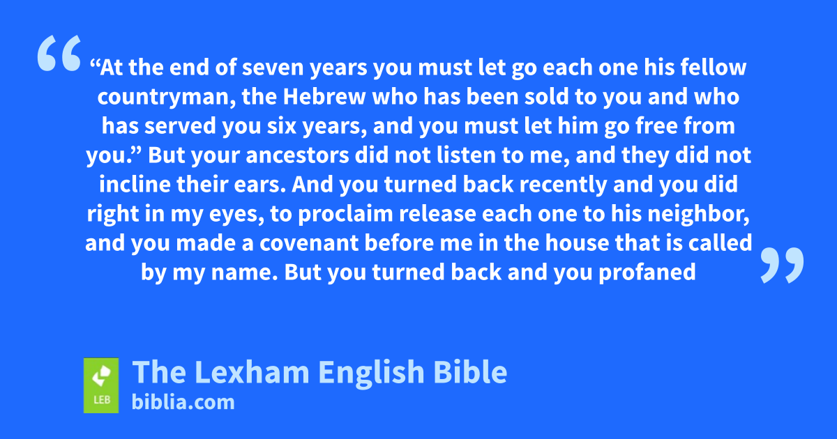 12 And the word of Yahweh came to Jeremiah from Yahweh, ⌊saying⌋,k 13 “Thus says Yahweh, the God of Israel: ‘I ⌊made⌋l a covenant with your ancestorsm on the day of my bringing them out from the land of Egypt, from the house of slaves, ⌊saying⌋,n 14 “At the end of seven years you must let go each one his fellow countryman, the Hebrew who has been sold to you and who has served you six years, and you must let him go free from you.” But your ancestorso did not listen to me, and they did not incline their ears.p 15 And you turned back ⌊recently⌋q and you did right in my eyes, to proclaim release each one to his neighbor, and you ⌊made⌋r a covenant ⌊before me⌋s in the house that is called ⌊by⌋t my name. 16 But you turned back and you profaned my name when you brought back each one his male slave and each one his female slave, whom you had let go free according to their desire, and you subdued them to be to you as male slaves and as female slaves.’