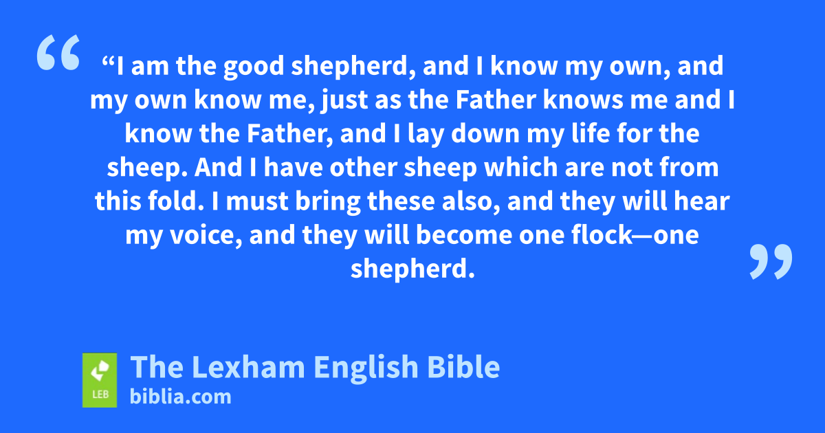 14 “I am the good shepherd, and I know my own, and my own know me, 15 just as the Father knows me and I know the Father, and I lay down my life for the sheep. 16 And I have other sheep which are not from this fold. I must bring these also, and they will hear my voice, and they will become one flock—one shepherd. 17 Because of this the Father loves me, because I lay down my life so that I may take possession of it again. 18 No one takes it from me, but I lay it down ⌊voluntarily⌋.d I have authority to lay it down, and I have authority to take possession of it again. This commandment I received from my Father.”