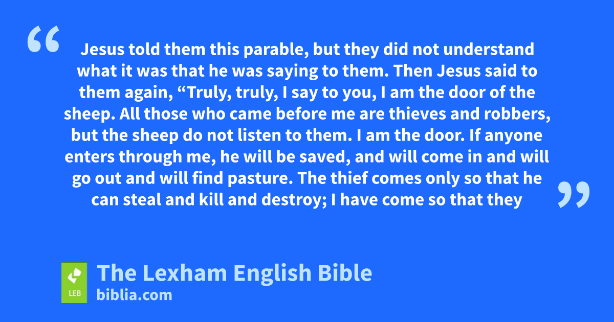 10 “Truly, truly I say to you, the one who does not enter through the door into the fold of the sheep, but climbs up at some other place—that one is a thief and a robber. 2 But the one who enters through the door is the shepherd of the sheep. 3 For this one the doorkeeper opens, and the sheep hear his voice, and he calls his own sheep by name and leads them out. 4 Whenever he sends out all his own, he goes before them, and the sheep follow him because they know his voice. 5 And they will never follow a stranger, but will flee from him, because they do not know the voice of strangers.” 6 Jesus told them this parable, but they did not understand what it was that he was saying to them.