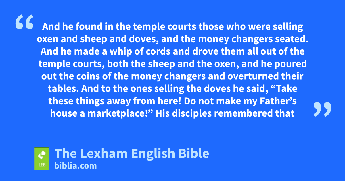 14 And he found in the temple courts* those who were selling oxen and sheep and doves, and the money changers seated. 15 And he made a whip of cords and* drove them* all out of the temple courts,* both the sheep and the oxen, and he poured out the coins of the money changers and overturned their* tables. 16 And to the ones selling the doves he said, “Take these things away from here! Do not make my Father’s house ⌊a marketplace⌋!”f 17 His disciples remembered that it is written, “Zeal for your house will consume me.”g