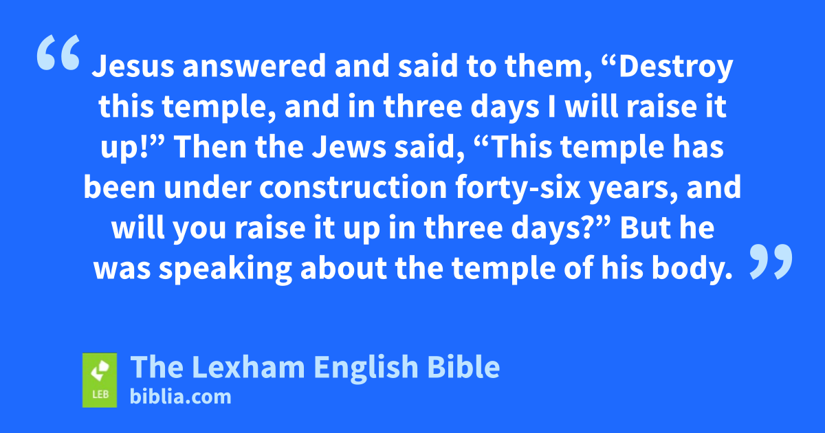 18 So the Jews answered and said to him, “What sign do you show to us, because you are doing these things?” 19 Jesus answered and said to them, “Destroy this temple, and in three days I will raise it up!” 20 Then the Jews said, “This temple has been under constructionh forty-six years, and will you raise it up in three days?” 21 But he was speaking about the temple of his body. 22 So when he was raised from the dead, his disciples remembered that he had said this, and they believed the scripture and the saying that Jesus had spoken.