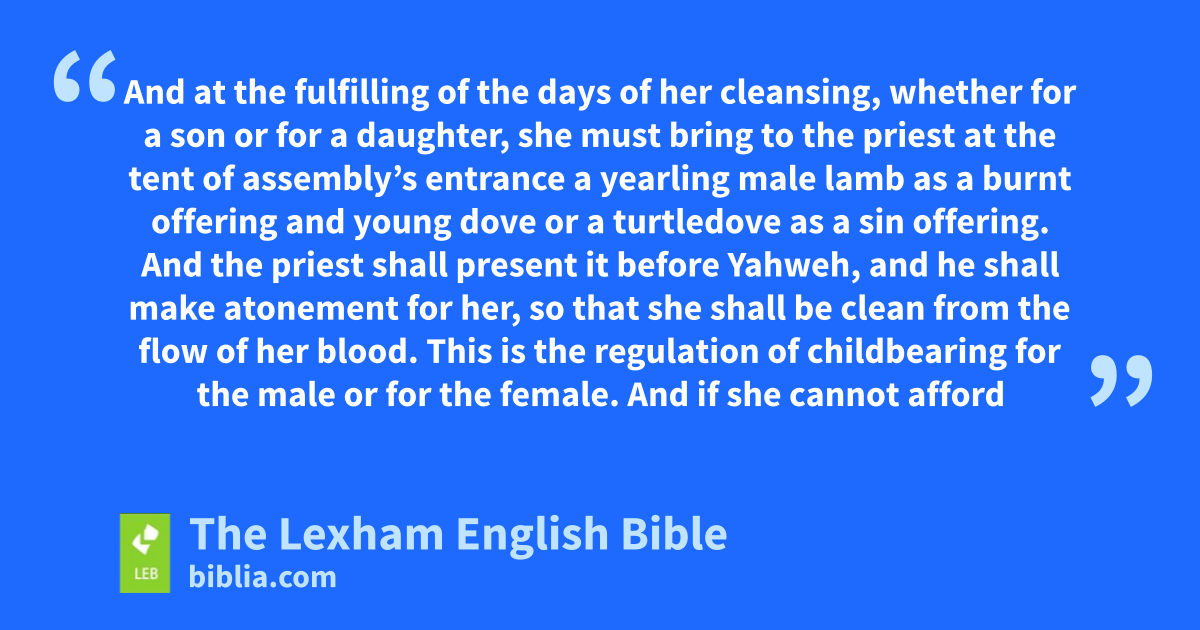 12 Thena Yahweh spoke to Moses, saying, 2 “Speak to the ⌊Israelites⌋,b saying, ‘When a woman becomes pregnant and she gives birth to a male,c thend she shall be unclean seven days—as in the time of her menstrual bleeding, she shall become unclean. 3 And on the eighth day his foreskin’s flesh shall be circumcised. 4 And for thirty-three days she shall stay in the blood of her cleansing; she must not touch any holy object, and she may not come to the sanctuary until the fulfilling of the days of her cleansing. 5 Bute if she gives birth to a female,f theng she shall be unclean for two weeks as in her menstruation, and for sixty-six days she shall stay ⌊through⌋h the blood of her cleansing. 6 And at the fulfilling of the days of her cleansing, whether for a son or for a daughter, she must bring to the priest at the tent of assembly’s entrance a ⌊yearling⌋i male lamb as a burnt offering and ⌊young dove⌋j or a turtledove as a sin offering. 7 And the priest shall present it ⌊before⌋k Yahweh, and he shall make atonement for her, so thatl she shall be clean from the flow of her blood. This is the regulation of childbearingm for the malen or for the female.o 8 And if ⌊she cannot afford⌋p a sheep,q thenr she shall take two turtledoves or two ⌊young doves⌋s—one as a burnt offering and one as a sin offering—and the priest shall make atonement for her, so thatt she shall be clean.’ ”