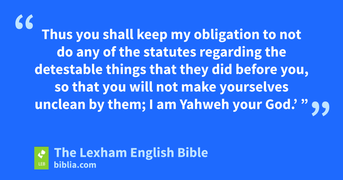 24 “ ‘You must not make yourself unclean in any of these things, because the nations whom I am driving out from your presence were made unclean by all of these. 25 Soe the land became unclean, and ⌊I have brought the punishment of⌋f its guilt upon it, and the land has vomited out its inhabitants. 26 Butg you (neither the native norh the alien who is dwelling in your midst) shall keep my statutes and my regulations, and you shall not ⌊practice⌋i any of these detestable things 27 (because the people of the land, who were ⌊before you⌋,j did all these detestable things, so the land became unclean), 28 so that the land will not vomit you out when you make it unclean just as it vomited out the nation that was ⌊before you⌋.k 29 Indeed, anyone who does any of these detestable things, evenl those persons who do so shall be cut off from the midst of their people. 30 Thusm you shall keep my obligation to not do any of the statutes ⌊regarding⌋n the detestable things that they did ⌊before you⌋,o so that you will not make yourselves unclean by them; I am Yahweh your God.’ ”