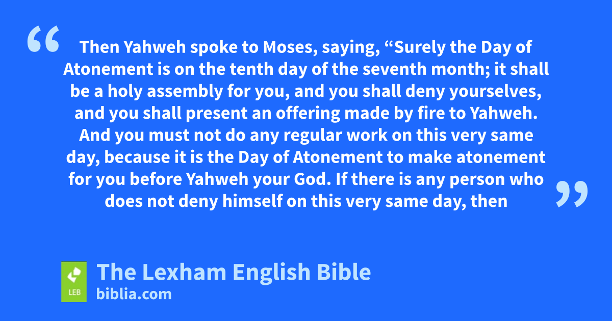 26 Thenw Yahweh spoke to Moses, saying, 27 “Surely the Day of Atonement is on the tenth day of the seventh month; it shall be a holy assembly for you, and you shall deny yourselves, and you shall present an offering made by fire to Yahweh. 28 And you must not do ⌊any regular work⌋x on ⌊this very same day⌋,y because it is the Day of Atonement to make atonement for you ⌊before⌋z Yahweh your God. 29 If there is any person who does not deny himself on ⌊this very same day⌋,a thenb he shall be cut off from his people. 30 As forc any person who does any work on ⌊this very same day⌋,d I will exterminate that person from the midst of his people. 31 You must not do any work; it is a ⌊lasting statute⌋e throughout your generations in all your dwellings. 32 It is ⌊a Sabbath of complete rest⌋f for you, and you shall deny yourselves on the ninth day of the month in the evening—from evening to evening you must observe your extraordinaryg Sabbath.”