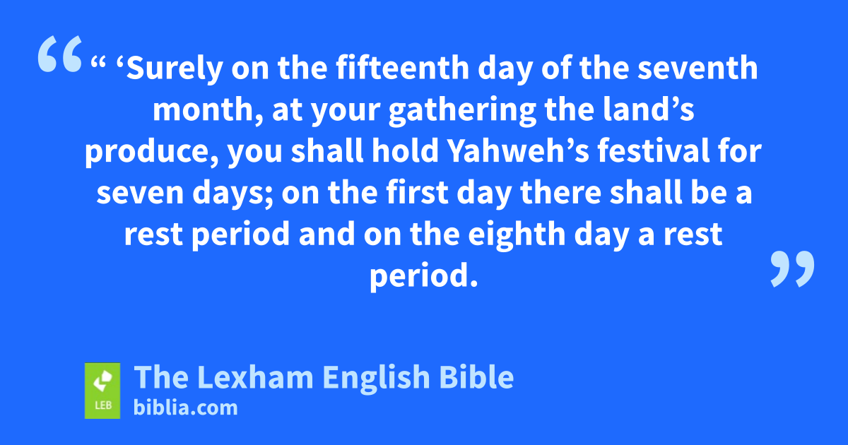 39 “ ‘Surely on the fifteenth day of the seventh month, at your gathering the land’s produce, you shall hold Yahweh’s festival for seven days; on the first day there shall be a rest period and on the eighth day a rest period. 40 And on the first day you shall take for yourselves the first fruit of majestic trees, branches of palm trees and branchesq of a leafy tree and of a brook’s poplar trees, and you shall rejoice ⌊before⌋r Yahweh your God for seven days. 41 And you must hold it as a festival for Yahweh for seven days in the year; it shall be a ⌊lasting statute⌋s throughout your generations; in the seventh month you must hold it. 42 You must live in the booths for seven days; all the natives in Israel must live in the booths, 43 so that your generations shall know that I made the ⌊Israelites⌋t live in booths when I brought them from the land of Egypt; I am Yahweh your God.’ ”