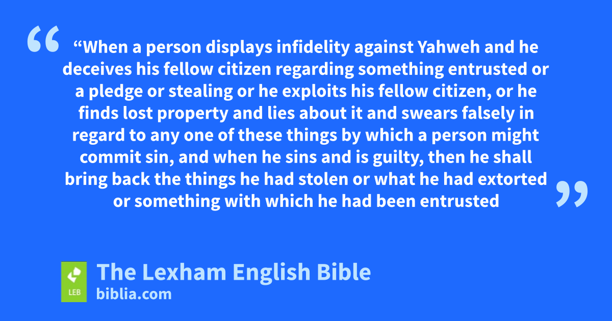 6 a Thenb Yahweh spoke to Moses, saying, 2 “When a personc ⌊displays infidelity⌋d against Yahweh and he deceives his fellow citizen regardinge something entrusted or ⌊a pledge⌋f or stealing or he exploits his fellow citizen, 3 or he finds lost property and lies about it and swears ⌊falsely⌋g ⌊in regard to⌋h any one of these things by which ⌊a person⌋i might commit sin, 4 ⌊and when⌋j he sins and is guilty, thenk he shall bring back ⌊the things he had stolen⌋l or ⌊what he had extorted⌋m or ⌊something with which he had been entrusted⌋n or the lost property that he had found, 5 or ⌊regarding⌋o anything about which he has sworn ⌊falsely⌋,p thenq he shall repay it ⌊according to⌋r its value and shall add one-fifth of its value to it—he must give it ⌊to whom it belongs⌋s on the day of his guilt offering. 6 And he must bring as his guilt offering to Yahweh a ram without defect from the flockt by your valuationu as a guilt offering to the priest, 7 and the priest shall make atonement for him ⌊before⌋v Yahweh, and he shall be forgiven ⌊anything⌋w from all that he might do ⌊by which he might incur guilt⌋.”x