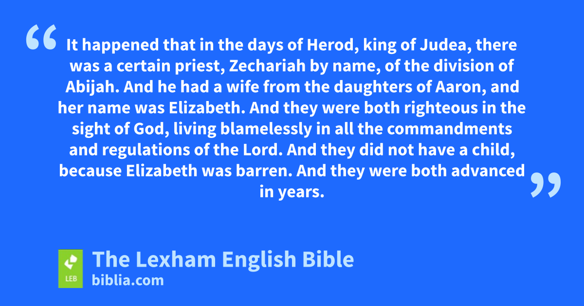 5 It happened that in the days of Herod, king of Judea, there was a certain priest, Zechariah by name, of the division of Abijah. And ⌊he had a wife⌋a from the daughters of Aaron, and her name was Elizabeth. 6 And they were both righteous in the sight of God, living blamelessly in all the commandments and regulations of the Lord. 7 And ⌊they did not have⌋b a child, because Elizabeth was barren. And they were both advanced ⌊in years⌋.c