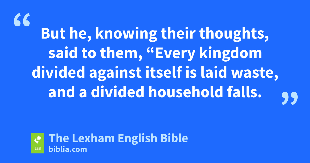 14 And he was expelling a mute demon.b Now it happened that when* the demon came out, the man who had been mute spoke, and the crowds were astonished. 15 But some of them said, “By Beelzebul the ruler of demons he expels demons!” 16 And others, in order to* test him,* were demanding from him a sign from heaven. 17 But he, knowing their thoughts, said to them, “Every kingdom divided against itself is laid waste, and ⌊a divided household⌋c falls. 18 So if Satan also is divided against himself, how will his kingdom stand? For you say that I expel demons by Beelzebul. 19 But if I expel demons by Beelzebul, by whom do your sons expel them?* For this reason they will be your judges! 20 But if I expel demons by the finger of God, then the kingdom of God has come upon you! 21 When a strong man, fully armed, guards his own palace, his possessions are ⌊safe⌋.d 22 But when a stronger man attacks him and* conquers him, he takes away his full armor in which he trusted and distributes his plunder. 23 The one who is not with me is against me, and the one who does not gather with me scatters.