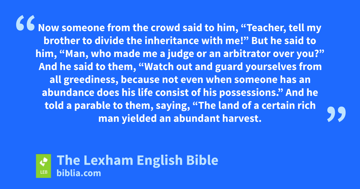 13 Now someone from the crowd said to him, “Teacher, tell my brother to divide the inheritance with me!” 14 But he said to him, “Man, who made me a judge or an arbitrator over you?” 15 And he said to them, “Watch out and guard yourselves from all greediness, because not even when someone has an abundance ⌊does⌋c his life consist of his possessions.” 16 And he told a parable to them, saying, “The land of a certain rich man yielded an abundant harvest. 17 And he reasoned to himself, saying, ‘What should I do? For I do not have anywhere I can gather in my crops.’ 18 And he said, ‘I will do this: I will tear down my barns and build larger ones, and I will gather in there all my grain and possessions. 19 And I will say to my soul, “Soul, you have many possessions stored up for many years. Relax, eat, drink, celebrate!” ’ 20 But God said to him, ‘Fool! This night your lifed is demanded from you, and the things which you have prepared—whose will they be?’ 21 So is the one who stores up treasure for himself, and who is not rich toward God!”