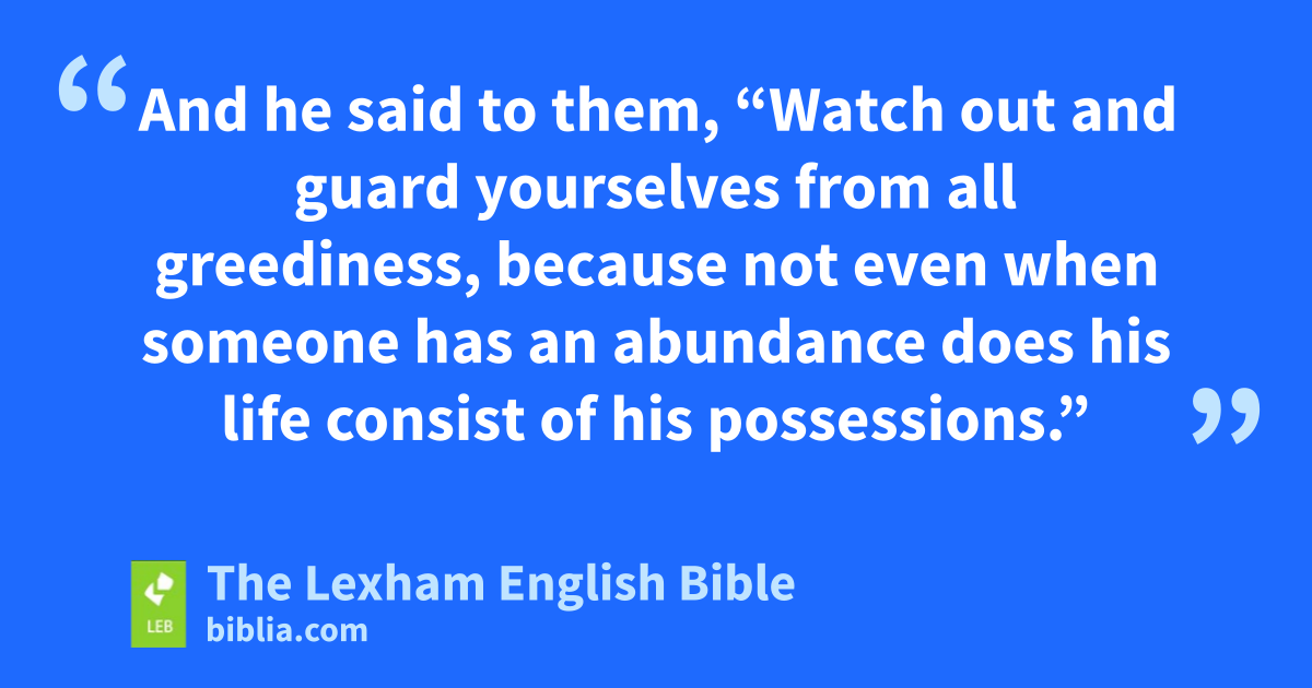 13 Now someone from the crowd said to him, “Teacher, tell my brother to divide the inheritance with me!” 14 But he said to him, “Man, who made me a judge or an arbitrator over you?” 15 And he said to them, “Watch out and guard yourselves from all greediness, because not even when someone has an abundance ⌊does⌋c his life consist of his possessions.” 16 And he told a parable to them, saying, “The land of a certain rich man yielded an abundant harvest. 17 And he reasoned to himself, saying, ‘What should I do? For I do not have anywhere I can gather in my crops.’ 18 And he said, ‘I will do this: I will tear down my barns and build larger ones, and I will gather in there all my grain and possessions. 19 And I will say to my soul, “Soul, you have many possessions stored up for many years. Relax, eat, drink, celebrate!” ’ 20 But God said to him, ‘Fool! This night your lifed is demanded from you, and the things which you have prepared—whose will they be?’ 21 So is the one who stores up treasure for himself, and who is not rich toward God!”