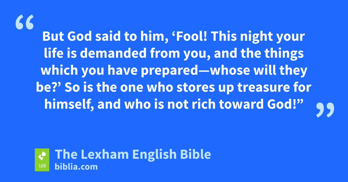 13 Now someone from the crowd said to him, “Teacher, tell my brother to divide the inheritance with me!” 14 But he said to him, “Man, who made me a judge or an arbitrator over you?” 15 And he said to them, “Watch out and guard yourselves from all greediness, because not even when someone has an abundance ⌊does⌋c his life consist of his possessions.” 16 And he told a parable to them, saying, “The land of a certain rich man yielded an abundant harvest. 17 And he reasoned to himself, saying, ‘What should I do? For I do not have anywhere I can gather in my crops.’ 18 And he said, ‘I will do this: I will tear down my barns and build larger ones, and I will gather in there all my grain and possessions. 19 And I will say to my soul, “Soul, you have many possessions stored up for many years. Relax, eat, drink, celebrate!” ’ 20 But God said to him, ‘Fool! This night your lifed is demanded from you, and the things which you have prepared—whose will they be?’ 21 So is the one who stores up treasure for himself, and who is not rich toward God!”