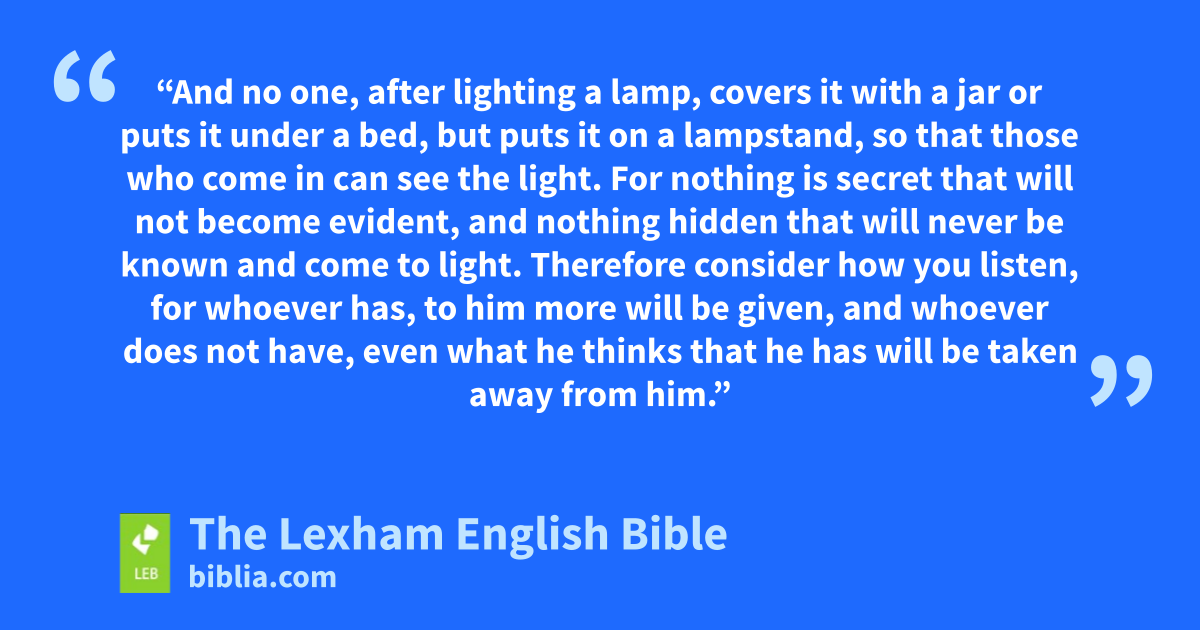 16 “And no one, after* lighting a lamp, covers it with a jar or puts it* under a bed, but puts it* on a lampstand, so that those who come in can see the light. 17 For nothing is secret that will not become evident, and nothing hidden that will never be known and come to light. 18 Therefore consider how you listen, for whoever has, to him more will be given, and whoever does not have, even what he thinks that he has will be taken away from him.”