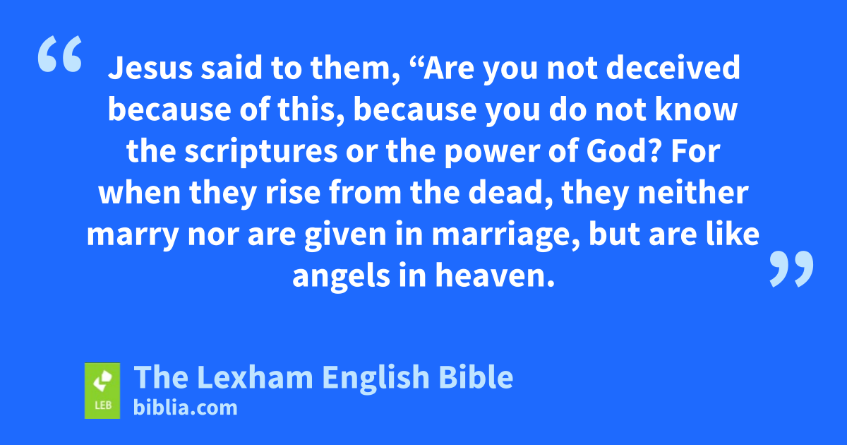 18 And Sadducees—who say there is no resurrection—came up to him and began to askf him, saying, 19 “Teacher, Moses wrote for us that if someone’s brother dies and he leaves behind a wife and does not leave a child, that his brother should take the wife and ⌊father⌋g descendants for his brother. 20 There were seven brothers, and the first took a wife. And when he* died, he did not leave descendants. 21 And the second took her, and he died without leaving descendants. And the third likewise. 22 And the seven did not leave descendants. Last of all the woman also died. 23 In the resurrection, when they rise, ⌊whose⌋h wife will she be? For the seven had her as wife. 24 Jesus said to them, “Are you not deceived because of this, because you* do not know the scriptures or the power of God? 25 For when they rise from the dead, they neither marry nor are given in marriage, but are like angels in heaven. 26 Now concerning the dead, that they are raised, have you not read in the book of Moses ⌊in the passage about the bush⌋i how God spoke to him, saying, ‘I am the God of Abraham and the God of Isaac and the God of Jacob’?j 27 He is not God of the dead, but of the living. You are very much mistaken!”