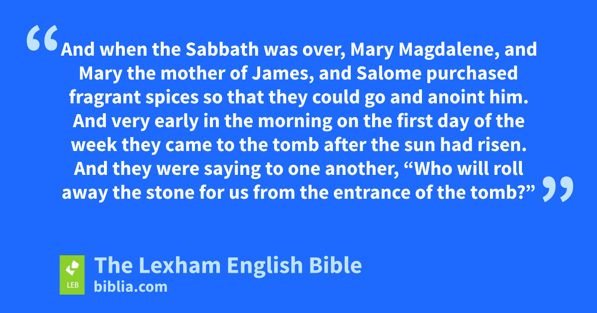 16 And when* the Sabbath was over, Mary Magdalene, and Mary the mother of James, and Salome purchased fragrant spices so that they could go and* anoint him. 2 And very early in the morning on the first day of the week they came to the tomb after* the sun had risen. 3 And they were saying to one another, “Who will roll away the stone for us from the entrance of the tomb?” 4 And when they* looked up, they saw that the stone had been rolled away (for it was very large). 5 And as they* were going into the tomb, they saw a young man dressed in a white robe sitting on the right side, and they were alarmed. 6 But he said to them, “Do not be alarmed. You are looking for Jesus the Nazarene who was crucified. He has been raised, he is not here! See the place where they laid him! 7 But go, tell his disciples and Peter that he is going ahead of you to Galilee. You will see him there, just as he told you.” 8 And they went out and* fled from the tomb, because trembling and amazement had seized them. And they said nothing to anyone, because they were afraid.a