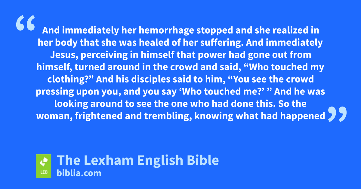 25 And there was a woman who was ⌊suffering from hemorrhages⌋i twelve years. 26 And she had endured many things under many physicians, and had spent ⌊all that she had⌋j and had received no help at all, but instead ⌊became worse⌋.k 27 When she* heard about Jesus, she came up in the crowd behind him and* touched his cloak, 28 for she was saying, “If I touch just his clothing, I will be healed!” 29 And immediately her ⌊hemorrhage stopped⌋l and she realized in herm body that she was healed of hern suffering. 30 And immediately Jesus, perceiving in himself that power had gone out from himself, turned around in the crowd and* said, “Who touched my clothing?” 31 And his disciples said to him, “You see the crowd pressing upon you, and you say ‘Who touched me?’ ” 32 And he was looking around to see the one who had done this. 33 So the woman, frightened and trembling, knowing what had happened to her, came and fell down before him and told him the whole truth. 34 But he said to her, “Daughter, your faith has healed you. Go in peace and be well from your suffering.”