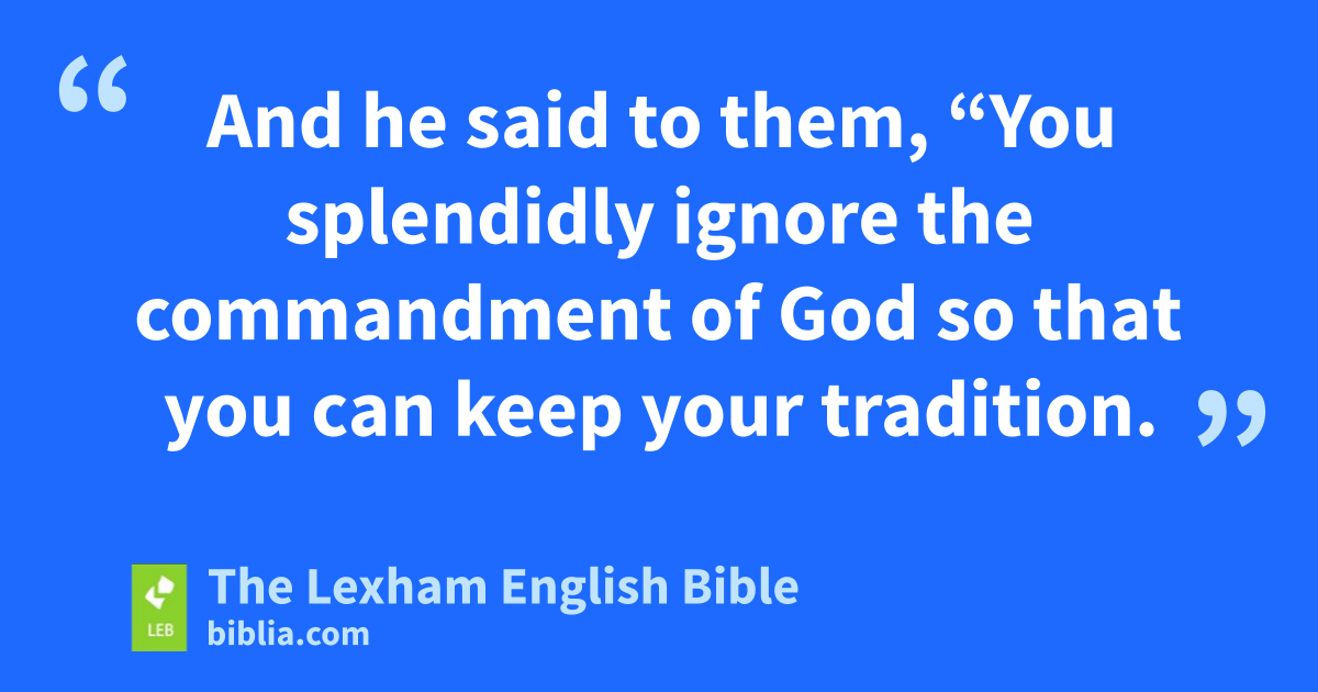 9 And he said to them, “You splendidly ignore the commandment of God so that you can keepi your tradition. 10 For Moses said, ‘Honor your father and your mother,’j and, ‘The one who speaks evil of father or mother ⌊must certainly die⌋k.’l 11 But you say, ‘If a man says to hism father or to hisn mother, “Whatever ⌊benefit you would have received⌋o from me is corban”p (that is, a gift to God), 12 you no longer permit him to do anything for hisq father or hisr mother, 13 thus* making void the word of God by your tradition that you have handed down, and you do many similar things such as this.”