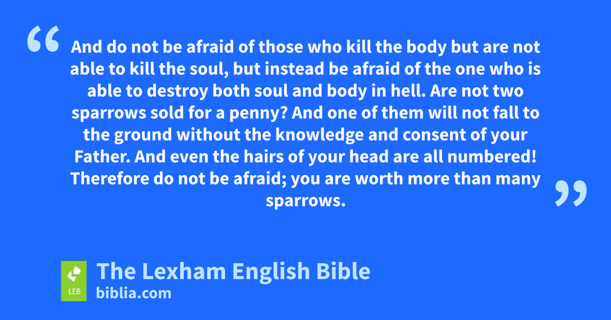 26 “Therefore do not be afraid of them, because nothing is hidden that will not be revealed, and nothing secret that will not become known. 27 What I say to you in the dark, tell in the light, and what you hear in your ear, proclaim on the housetops. 28 And do not be afraid of those who kill the body but are not able to kill the soul, but instead be afraid of the one who is able to destroy both soul and body in hell. 29 Are not two sparrows sold for a penny?f And one of them will not fall to the ground ⌊without the knowledge and consent⌋g of your Father. 30 And even the hairs of your head are all numbered! 31 Therefore do not be afraid; you are worth more than many sparrows.