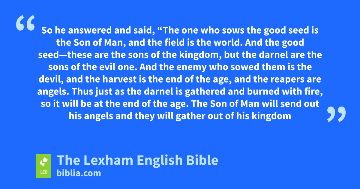 36 Then he left the crowds and* came into the house, and his disciples came to him saying, “Explain the parable of the darnel in the field to us.” 37 So he answered and* said, “The one who sows the good seed is the Son of Man, 38 and the field is the world. And the good seed—these are the sons of the kingdom, but the darnel are the sons of the evil one. 39 And the enemy who sowed them is the devil, and the harvest is the end of the age, and the reapers are angels. 40 Thus just as the darnel is gathered and burnedp with fire, so it will be at the end of the age. 41 The Son of Man will send out his angels and they will gather out of his kingdom all the causes of sin and those who do lawless deeds, 42 and throw them into the fiery furnace.q In that place there will be weeping and gnashing of teeth! 43 Then the righteous will shine like the sun in the kingdom of their Father.r The one who has ears, let him hear!