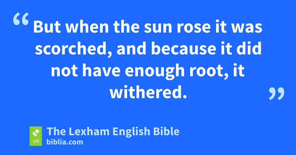 18 “You, therefore, listen to the parable of the sower: 19 When* anyone hears the word about the kingdom and does not understand it,* the evil one comes and snatches away what was sown in his heart. This is what was sown on the side of the path. 20 And what was sown on the rocky ground—this is the one who hears the word and immediately receives it with joy. 21 But he does not have a root in himself, but ⌊lasts only a little while⌋,h and when* affliction or persecution happens because of the word, immediately he falls away. 22 And what was sown into the thorn plants—this is the one who hears the word, and the anxiety of this worldi and the deceitfulness of wealth choke the word and it becomes unproductive. 23 But what was sown on the good soil—this is the one who hears the word and understands it,* who indeed bears fruit and produces, this one a hundred times as much, and this one sixty, and this one thirty.”