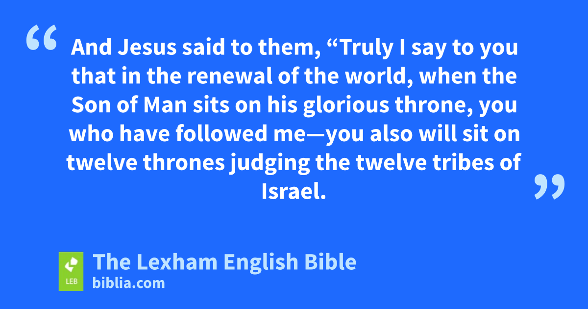23 And Jesus said to his disciples, “Truly I say to you that with difficulty a rich person will enter into the kingdom of heaven! 24 And again I say to you, it is easier for a camel to go through the eye of a needle than a rich person intog the kingdom of God.” 25 So when* the disciples heard this,* they were extremely amazed, saying, “Then who can be saved?” 26 But Jesus looked at them* and* said to them, “With human beings this is impossible, but with God all things are possible.” 27 Then Peter answered and* said to him, “Behold, we have left everything and followed you. What then will there be for us?” 28 And Jesus said to them, “Truly I say to you that in the renewal of the world,h when the Son of Man sits on his glorious throne, you who have followed me—you also will sit on twelve thrones judging the twelve tribes of Israel. 29 And everyone who has left houses or brothers or sisters or father or mother or wifei or children or fields on account of my name will receive a hundred times as much, and will inherit eternal life. 30 But many who are first will be last, and the last first.