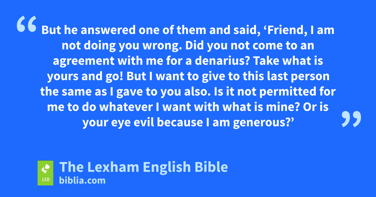 20 “For the kingdom of heaven is like a man—the master of the house—who went out early in the morning to hire workers for his vineyard. 2 And after* coming to an agreement with the workers for a denarius per day, he sent them into his vineyard. 3 And going out about the third hour, he saw others standing idle in the marketplace. 4 And to those people he said, ‘You also go into the vineyard, and I will give you whatever is right.’ 5 So they went. Going outa again about the sixth and ninth hour he did the same thing. 6 And about the eleventh hour he went out and* found others standing there and said to them, ‘Why are you standing here the whole day unemployed?’ 7 They said to him, ‘Because no one hired us.’ He said to them, ‘You go also into the vineyard.’ 8 And when* evening came, the owner of the vineyard said to his manager, ‘Call the workers and pay them theirb wages, beginning from the last up to the first.’ 9 And when the ones hired about the eleventh hour came, they received a denarius apiece. 10 And when* the first came, they thought that they would receive more, and they also received a denarius apiece. 11 And when they* received it,* they began to complainc against the master of the house, 12 saying, ‘These last people worked one hour and you made them equal to us who have endured the burden of the day and the burning heat!’ 13 But he answered one of them and* said, ‘Friend, I am not doing you wrong. Did you not come to an agreement with me for a denarius? 14 Take what is yours and go! But I want to give to this last person the same as I gaved to you also. 15 Is it note permitted for me to do whatever I want with what is mine? Or is your eye evil because I am generous?’ 16 Thus the last will be first and the first last.”